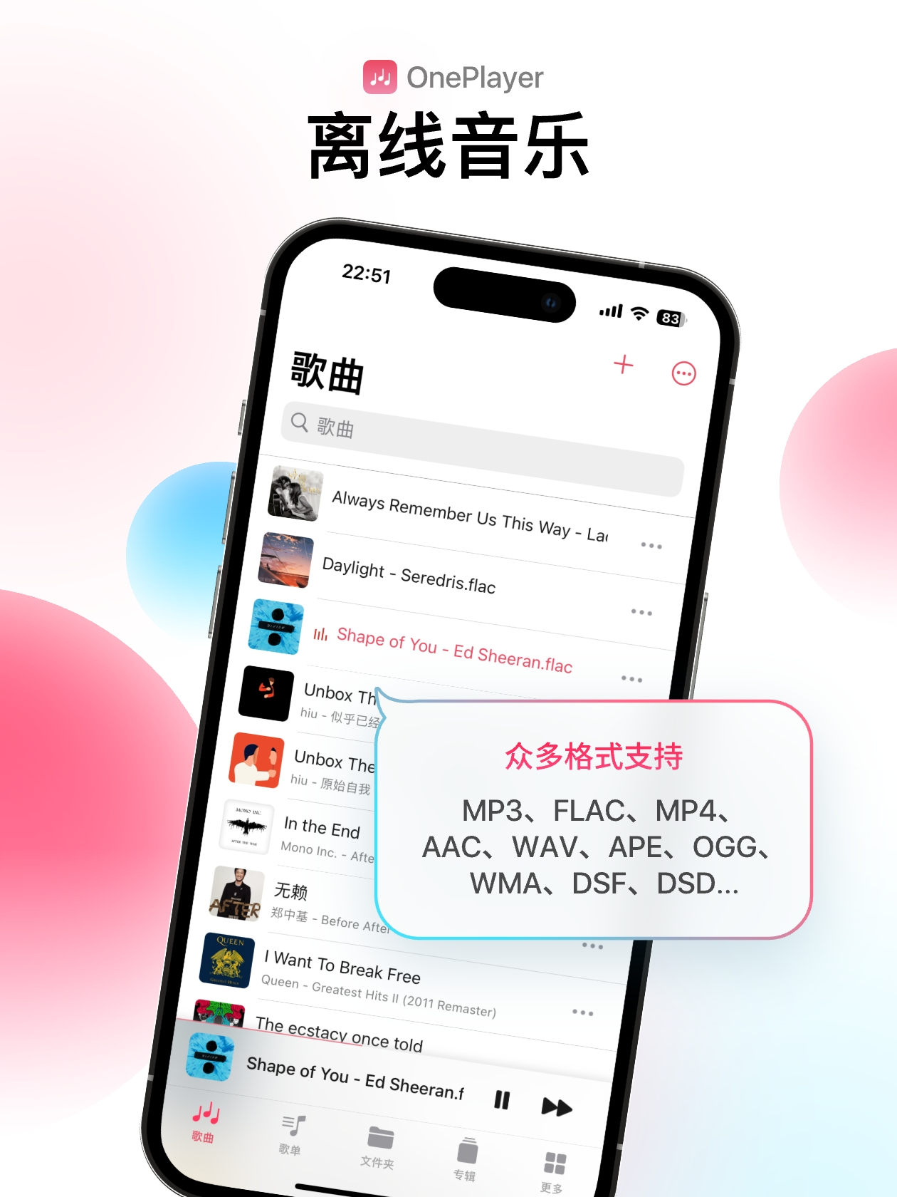 支持按歌曲、专辑、播放列表、艺人,文件等类型展示管理播放你的所有本地音乐