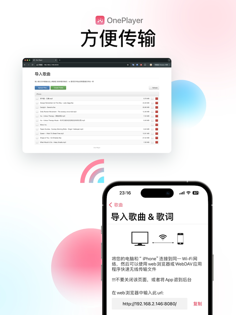 App支持多种导入方式:wifi导入、文件导入、AirDrop导入、扫描导入系统本地音乐库。详细方法可查看导入指南。